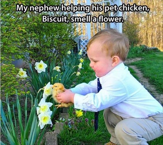 Un petit garçon aidant son poussin "Biscuit" à sentir une fleur.