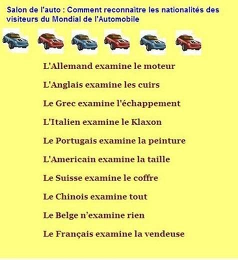 Trois clients s'attablent dans un restaurant. Quand le patron vient prendre la commande, l'un deux lui lance: - Je peux vous dire ce qu'il y avait hier dans ces trois assiettes... - Monsieur, fait le patron, nos assiettes sont toujours très bien lavées en machine et essuyées. - Je n'en doute pas, mais j'ai un odorat exceptionnel. - C'est impossible. Si vous y arrivez, je vous offre le déjeuner à tous les trois ! L'autre prend la première assiette et la sent. - Escalope milanaise. Il flaire la deuxième. - Rougets à la provençale. Puis la troisième. - Choucroute alsacienne. - Monsieur, fait le patron, vous êtes stupéfiant. C'étaient effectivement nos trois plats du jour, vous avez gagné ! Le lendemain, les trois clients reviennent. - On fait quitte ou double ? D'accord, dit le restaurateur, je vais chercher les assiettes. Il passe dans la cuisine et dit à la jeune femme qui est aux fourneaux: - Josette, ne cherchez pas à comprendre, prenez cette assiette et frottez-la contre votre foufounette ! La nommée Josette s'exécute, et le patron ramène trois assiettes dont celle-là. Le client flaire la première. - Boeuf bourguignon. Il sent la seconde. - Canard au poivre vert. Et enfin la troisième. Il a l'air surpris, la renifle de nouveau, et dit au patron: - Josette travaille chez vous ? Deux belges vont en camping. Ils installent leur tente dans une clairière et se couchent pour dormir. Quelques heures plus tard, l'un d'eux réveille l'autre et lui dit: - Regarde dans le ciel et dis-moi ce que tu vois. - Des millions d'étoiles ! Et qu'est-ce que ça veut dire, selon toi ? Le Belge interprète la question un instant, prend un air intelligent et dit: - Astronomiquement parlant, cela veut dire qu'il y a des millions de galaxies et des milliards de planètes dans le vaste espace. Astrologiquement, cela me dit que Saturne est en Verseau. Pour l'heure, je dirais qu'il est quatre heures du matin. Théologiquement parlant, il est évident que Dieu est tout puissant et que nous sommes petits et faibles. Météorologiquement, il semblerait qu'il fera très beau demain. Après s'être fait dévisager par l'autre Belge pendant quelques minutes il reprend: - Quoi, qu'est-ce que j'ai dit de mal ? - Triple idiot... et concrètement ça veut simplement dire qu'on s'est fait voler la tente !