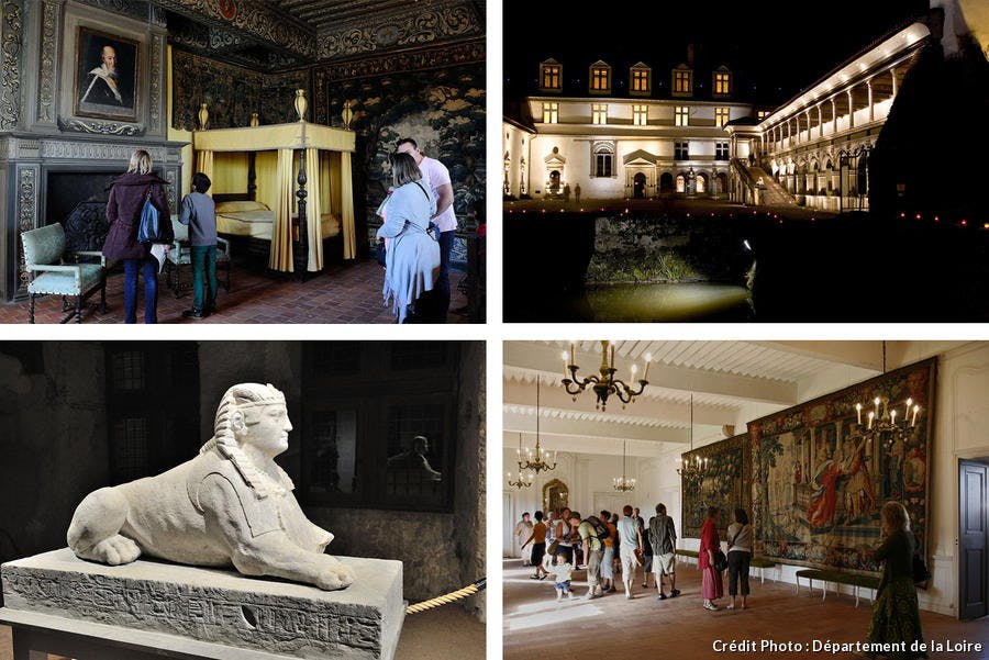 Les pièces, le sphinx et une magnifique vue du château de nuit : le charme opère. Un castel à visiter ! Celle de gauche, l’ancien corps de garde, est d’une sobriété toute militaire; contraste saisissant avec celle de droite,très italianisante avec sa galerie à laquelle on accède par une rampe cavalière. En bas de la rampe, un sphinx, promu mystérieux protecteur des lieux, notamment de la bibliothèque au premier étage : au temps de la splendeur des d’Urfé, elle a abrité jusqu’à 4 000 volumes !