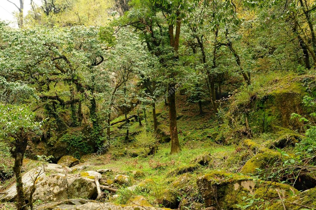 Les Forêts Dans Les Plaines. Grande forêt tropicale de montagne dans l'Himalaya indien à 2500 mètres d'altitude...Dans la plaine indo-gangétique à la base des montagnes, plaine alluviale drainée par les réseaux fluviaux de l'Indus, du Gange et du Brahmapoutre, la végétation varie d'ouest en est selon les précipitations. Source...Une Petite Forêt Himalayienne De Rhododendrons Tout Droit Sortie D'un Conte De Fée...