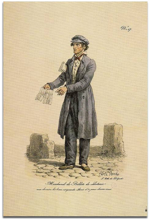 Carle Vernet (1758-1836) est un peintre de genre et de chevaux, dessinateur et lithographe français. La partie de son œuvre la plus populaire est celle consacrée aux petits métiers de Paris dont nous reproduisons 38 lithographies aquarellées d'époque, extraites du recueil les "Cris de Paris", édité par Delpech (1ère édition de 1825).