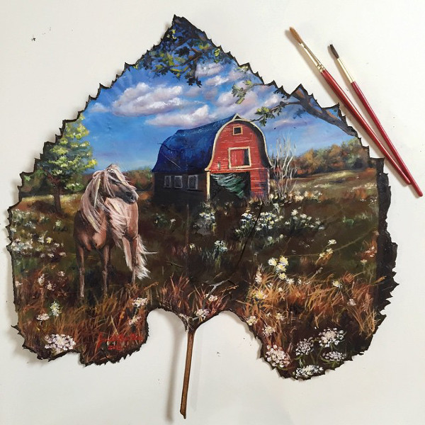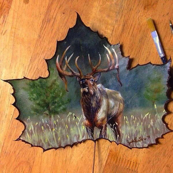 Janette Rose est une artiste américaine qui peint ses œuvres sur des feuilles d'arbres. Ses animaux peints sur de grandes feuilles d'érables et de sycomores sont fins et réalistes.