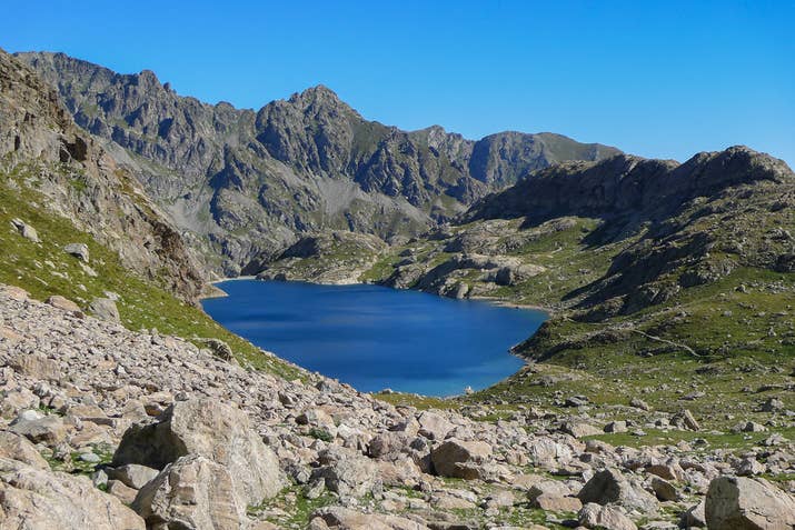 2 Le sentier commence véritablement ici juste en face de l'île Rousse. Après avoir traversé la plage de galets des Engraviers, le chemin monte pour le passage le plus difficile de la randonnée.