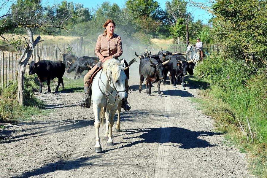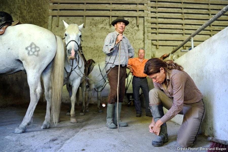 Les chevaux camarguais de la manade de Jacques Mailhan courent en totale liberté dans le sansouïre vers l'étang de Malagroy. Quelques codes en Camargue Le mistral a lavé le ciel. Sans entrave, le soleil répand sa lumière douce et cuivrée sur les rizières, les étangs, les champs de blé coupé ponctués de bottes de foin, les pâturages encore verts. Les oiseaux chantent dans les peupliers frémissants sous l’effet du vent. Il est 8 heures. Dans le sud-ouest du delta du Rhône, à quelques kilomètres des Saintes-Maries-de-la-Mer, Florence Clauzel accueille ses gardians dans la manade Saint-Antoine. Cette belle quadragénaire, rouge aux lèvres et crinière rousse domptée dans une queue-de-cheval, met un point d’honneur à respecter l’élégant code vestimentaire de la Camargue, avec sa chemise à pois et son pantalon de gardian ajustés. « Cela fait partie de nos traditions. Sans cela, on travaillerait en jean et casquette ! » Après avoir passé vingt ans à Paris, elle est revenue sur ses terres il y a douze ans pour élever taureaux et chevaux.