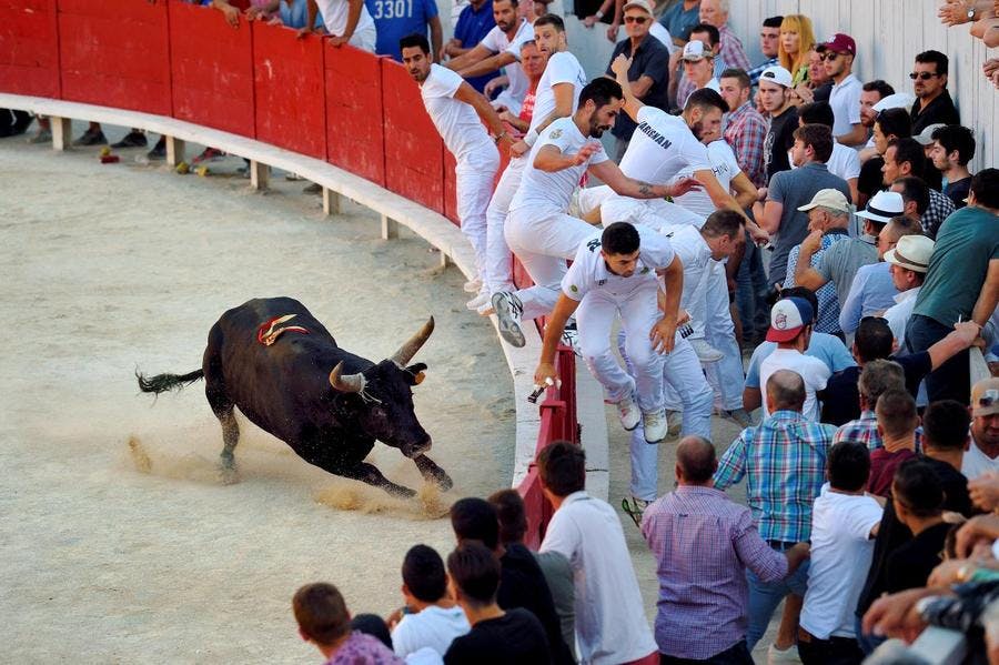 Comme les autres, il a 15 minutes face à 23 raseteurs vêtus de blanc, aidés de « tourneurs » qui attirent l’attention du taureau pour le placer au mieux et faciliter le geste des joueurs. Nous sommes désormais familiers du raset, ce moment où l’on retient son souffle alors qu’un « joueur » frôle les cornes du taureau pour lui enlever ses attributs et emporter la prime associée. Les raseteurs qui s’envolent telle une nuée d’oiseaux et bondissent au-dessus des barrières quand le taureau les menace sont aussi nos hérosdu jour. Ils ne manquent pas de courage. Ce soir, Saint-Vincent a blessé l’un d’eux. « Cela fait partie du jeu », confie notre voisine de gradin, une arlésienne quinquagénaire qui ne manque jamais une course ici.