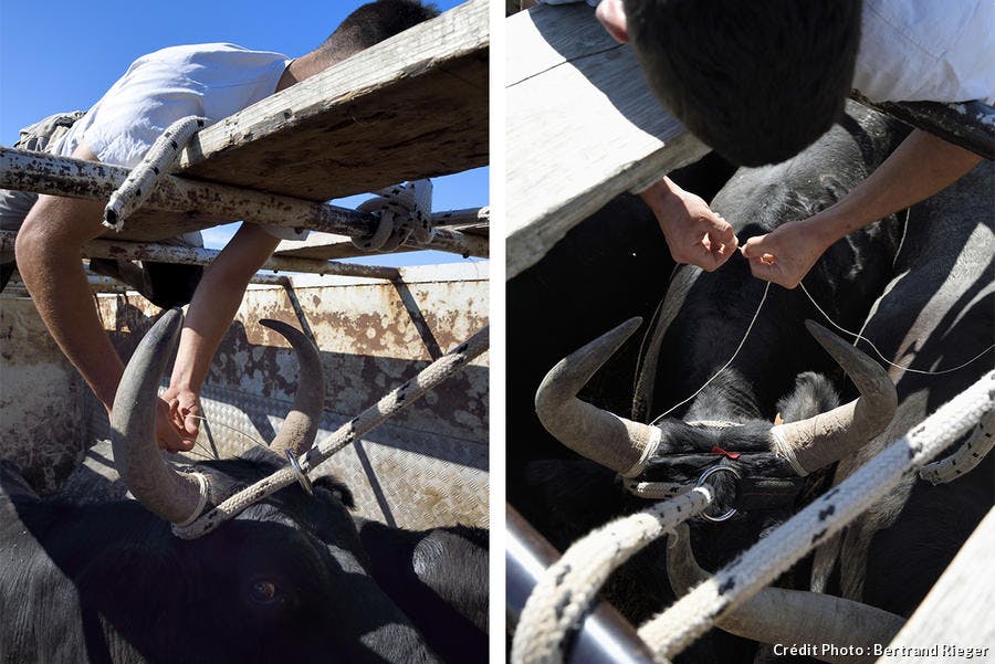 L'encocardement« Chut... », intime Alexandre Clauzel lorsque l’on grimpe sur une palissade près du « char ». Allongé sur une des planches en bois fixées au sommet du camion à la place du toit, il dégaine son opinel et tire d’une petite mallette des bobines de ficelles et des pompons. Sous lui, les taureaux meuglent, encordés aux planches par leurs cornes. C’est toujours le frère de Florence qui réalise l’encocardement. D’un geste bref et précis, il attache des attributs sur la tête du taureau qui devront être retirés avec un crochet par les raseteurs (les joueurs) lors de la course. Ce jeu sportif, sans mise à mort, appelé aussi course à la cocarde, fédère des milliers de passionnés, du Gard à l’Hérault en passant par le Vaucluse et bien sûr l’ouest des Bouches-du-Rhône, avec un cœur battant dans le delta.