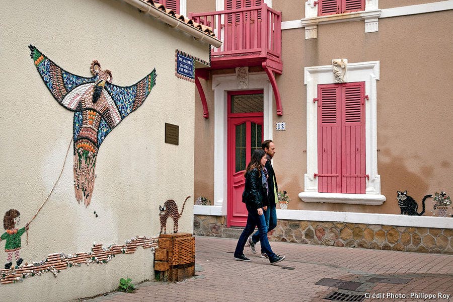 Un joyeux bestiaire dans le quartier de l'île Penotte : rue Trompeuse ou rue Monte-à-Peine, les façades sont ornées de mosaïques composées de milliers de coquillages.