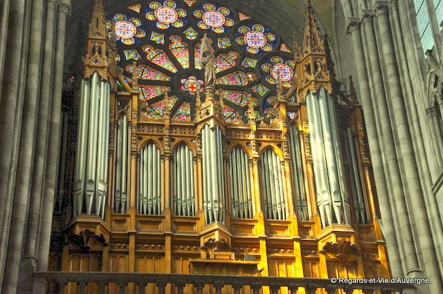 Depuis les toits de la cathédrale, on peut voir au loin, le puy de Dôme. La cathédrale gothique, dont l’architecture s’inspire des sanctuaires majeurs de l’Île-de-France, cache un intérieur riche :maître-autel en cuivre doré, fresques des chapelles de l’abside, horloge à jacquemarts et surtout, un ensemble de vitraux (du XIIe au XXe siècle) aux tons rouges et bleus, sans oublier les deux rosaces inondant de lumière rouge ou violine le transept. Hissez-vous d’une cinquantaine de mètres au-dessus de la ville en escaladant les marches de la tour de la Bayette, panorama imprenable garanti !