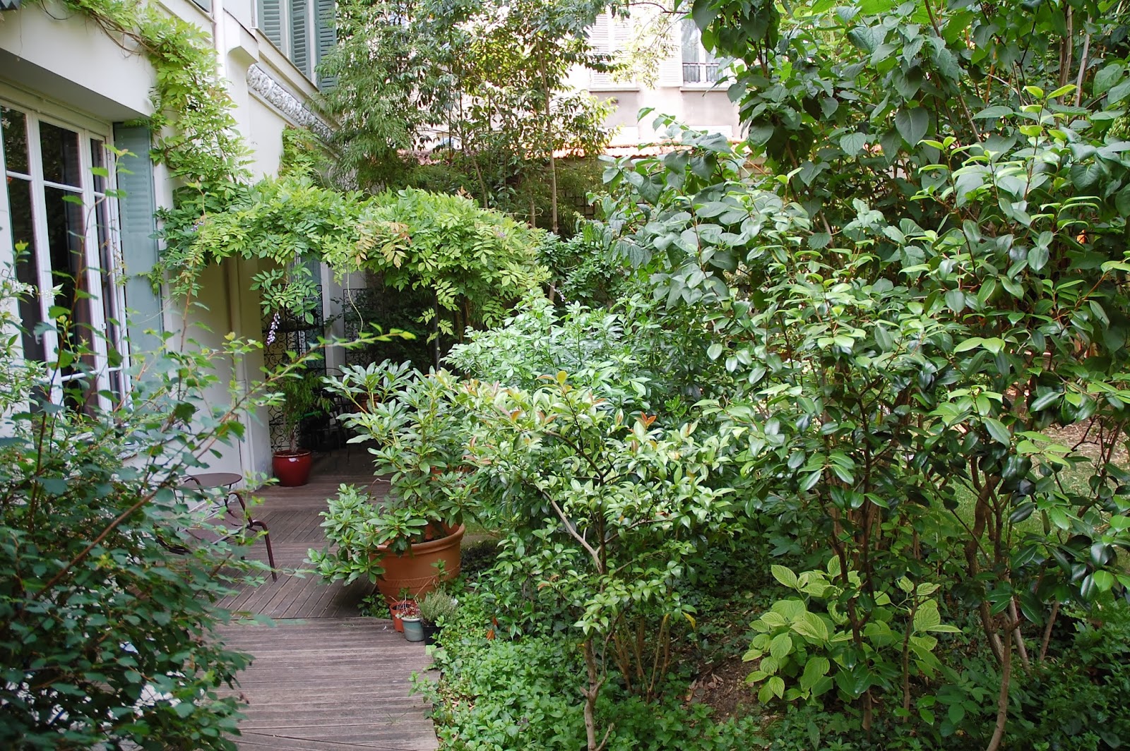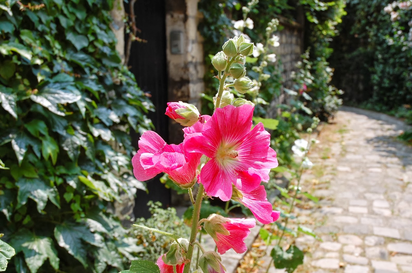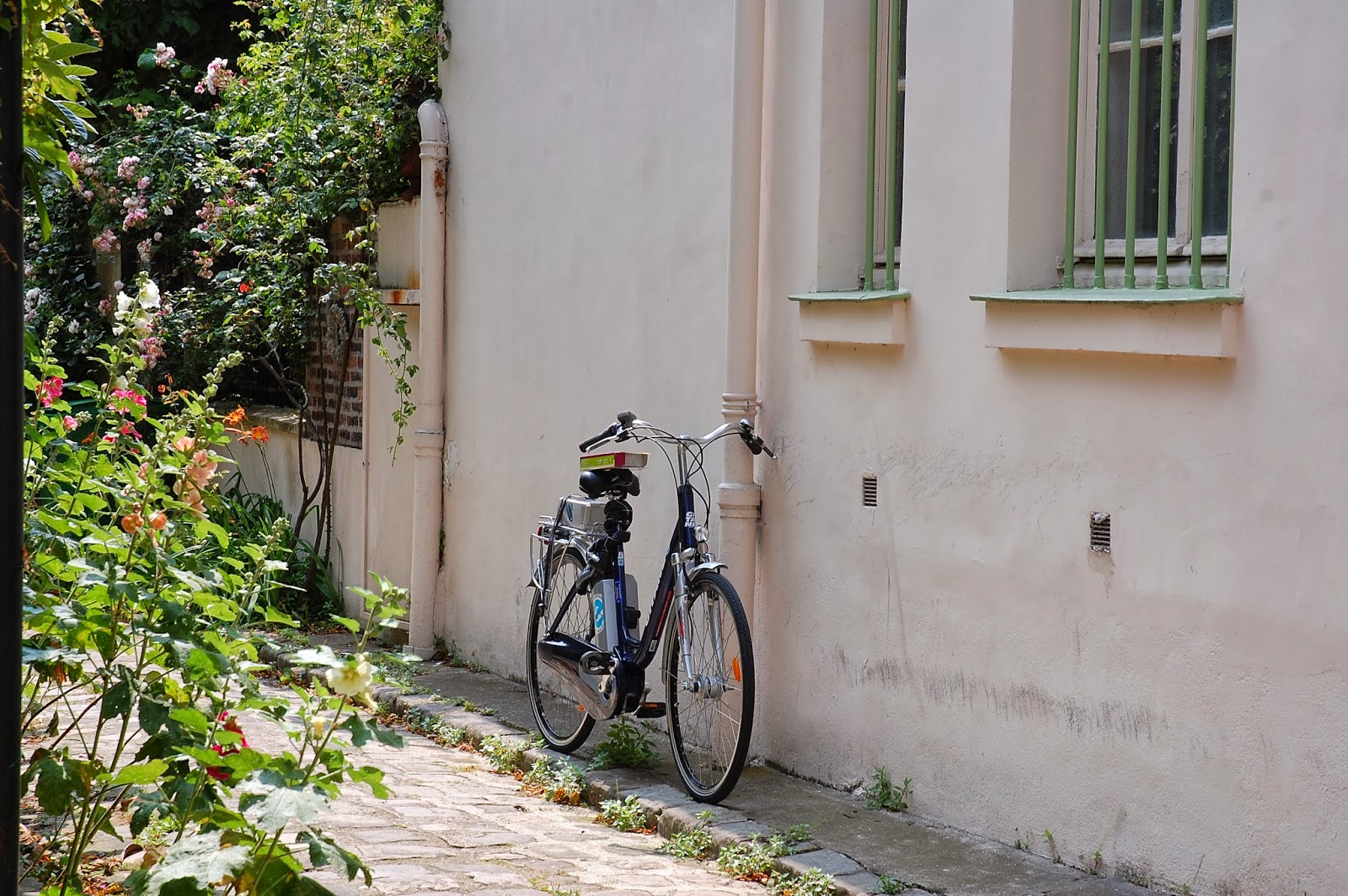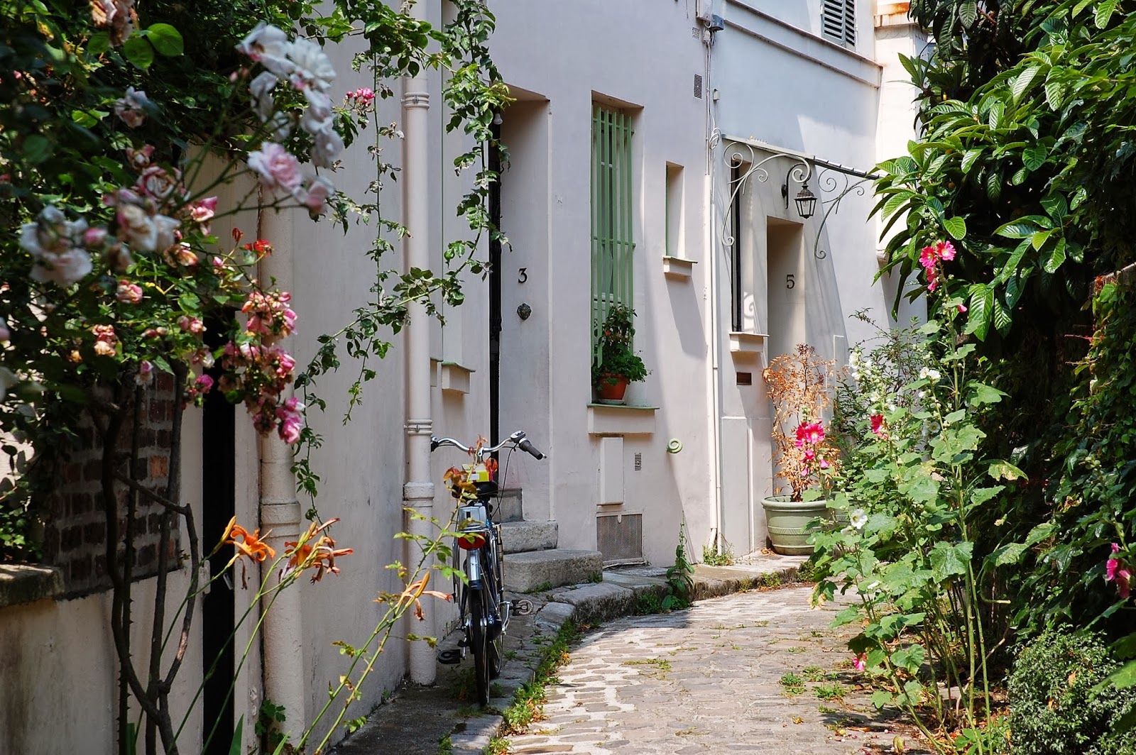 Une fois les portes du Paradis ouvertes, la Villa Hallé nous offre une belle carte postale et nous sommes tombés en admiration..Des roses trémières, des pavés, des volets verts, un vélo posé contre le mur... On se croirait à l'île de Ré, non ?