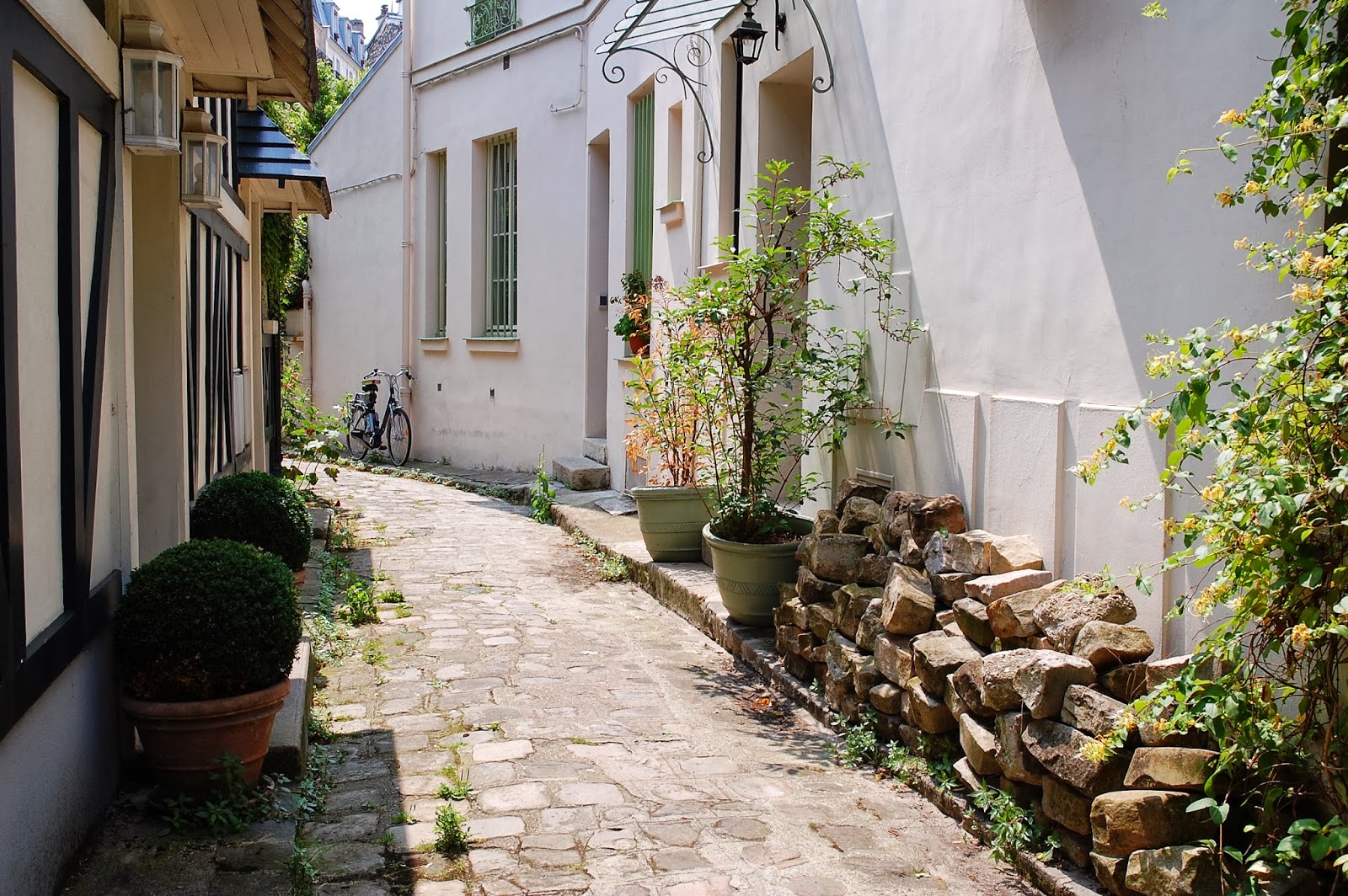 La villa Hallé est une petite impasse privée du 14 ème arrondissement au charme bien particulier. Nous étions persuadés qu'elle était "ouverte" au public et nous avons vite déchantés une fois sur place ! Bien protégée derrière sa grille imposante, elle nous laisse entrevoir toute sa beauté, et nous frustre d'autant plus. Le pass d'entrée ? Un sourire + un riverain conciliant ! Une fois les portes du Paradis ouvertes, la Villa Hallé nous offre une belle carte postale et nous sommes tombés en admiration..Des roses trémières, des pavés, des volets verts, un vélo posé contre le mur... On se croirait à l'île de Ré, non ?
