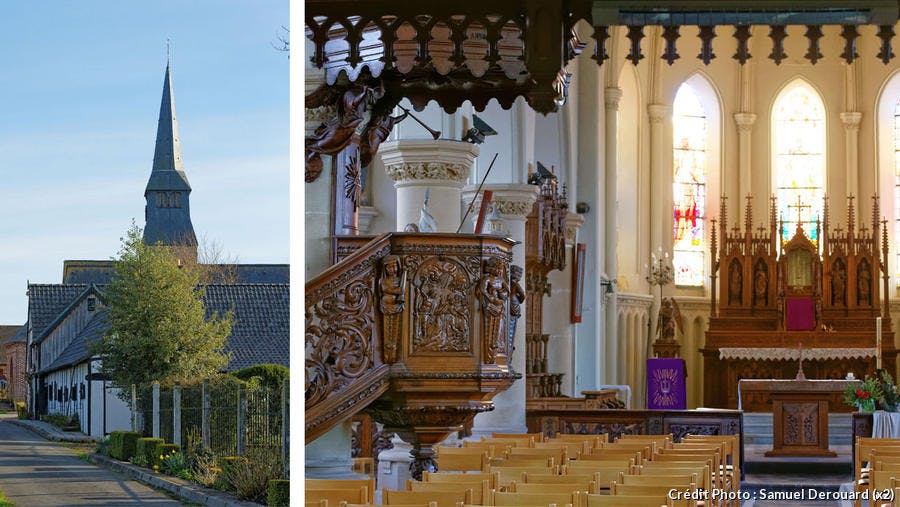 Tant par son architecture extérieure que par sa beauté intérieure !Autour de l’église s’alignent des maisons de style flamand, petite brique rouge et pan de bois, impeccablement entretenues...Dont les toitures toutes de « pannes » (tuiles vernissées) luisent au soleil dans des teintes variant de l’orangé au gris nacré, du rouge au bleu-violet.