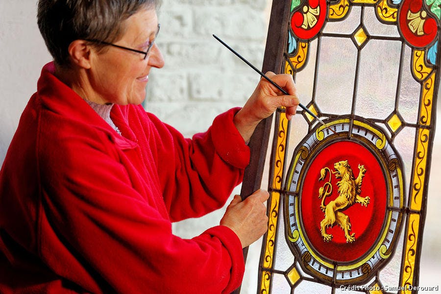 Dominique Berthilier, maître peintre verrier, attelée à la rénovation d’un vitrail. Le Nord est un pays où le vent aime s’époumoner... si c’est pour le plaisir de faire tourner les ailes des moulins !