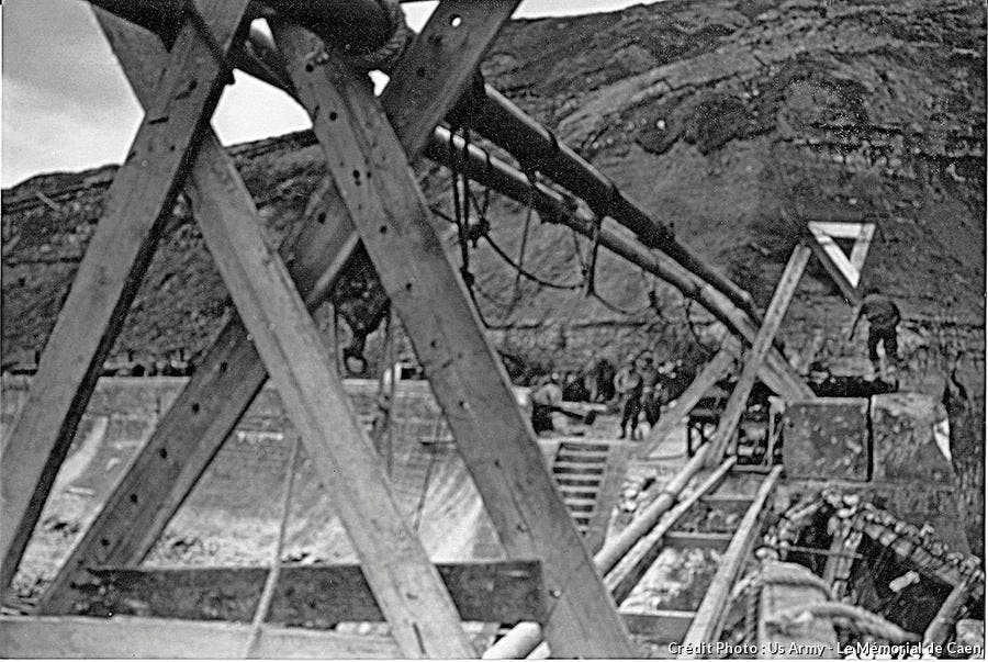 Débarquement, des pétroliers firent la navette entre l’Angleterre et Port-en-Bessin, rapidement, un oléoduc fut installé à travers la Manche,entre l’île de Wight et Cherbourg.
