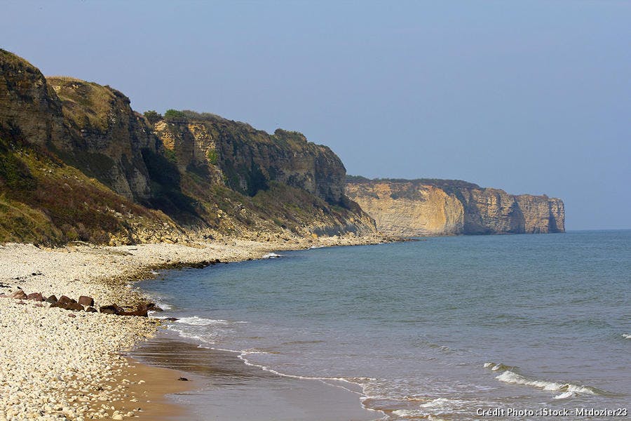 De là, côté terre, on voit les escarpements du rivage et on distingue des blockhaus ; côté mer, si le flot est commencé, on voit la vague qui inéluctablement se rapproche. On se trouve alors en condition idéale pour imaginer ce qui se passa ici le 6 juin 1944. Plage gagnée au prix de 3 000 morts. À 6 h 30, comme les premières vagues d’assaut se préparent à jaillir de leurs péniches de débarquement, les bombardements aériens sont supposés avoir réduit les batteries côtières au silence. Malheureusement, les avions ont manqué leurs cibles.