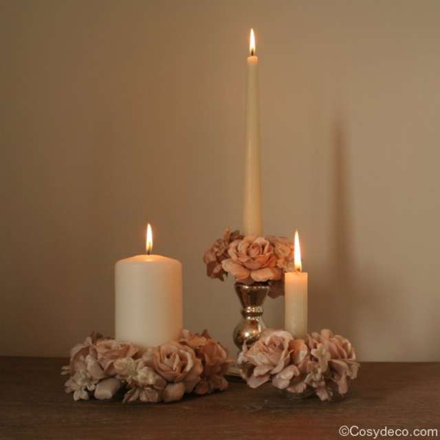 Quant au danger, il peut venir des jolies décorations florales comme celles ci-dessus! Une fois la bougie consummée presque entièrement, les fleurs ou les décorations artificielles prennent feu!!!! Alors oui, c'est trés joli, mais trés dangereux! Pensez à mettre vos bougies dans un verre et posez la couronne de fleurs autours, jamais directement autour de la bougie.