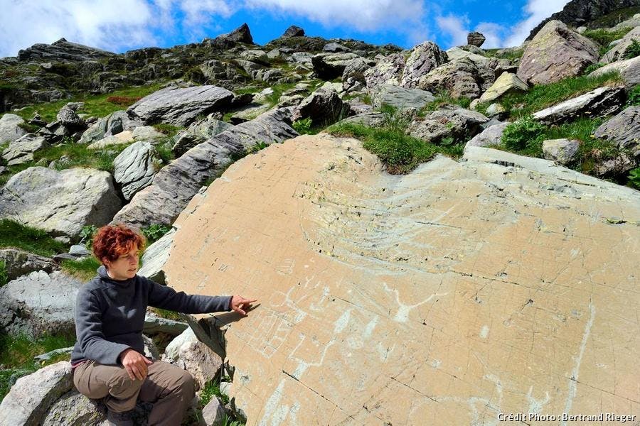 L'archéologue Nicoletta Bianchi (docteur en préhistoire et auteure d'une thèse sur le contexte archéologique et chronologique des gravures protohistoriques de la région du mont Bégo) devant la roche de l'Éclat,gravée de figures corniformes et de poignards.