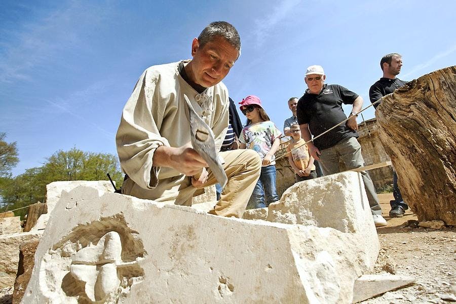 Pénétrer sur le chantier de Guédelon, c’est effectuer un grand plongeon au Moyen Âge. Les chevaux de traits assurent le transport des matériaux. Les engins de levage – tels les cages à écureuil – ont été reconstitués fidèlement. Les ouvriers et les artisans, en habit médiéval, travaillent avec les mêmes outils qu’au XIIIe siècle. Les bûcherons, les maçons, les charpentiers, les forgerons utilisent les techniques de l’époque. Rendez-vous à l’un des ateliers de pierre. Si le château est principalement en grès ferrugineux, qui lui donne sa si belle couleur « rouille », le calcaire, extrait d’une carrière des environs, est utilisé pour les parties les plus nobles. « Mélanger pierre calcaire et grès ferrugineux fait partie de la culture architecturale de la Puisaye… On utilise le grès pour les murs droits et le calcaire pour les encadrements de portes et de fenêtres, par exemple, explique un tailleurde pierre. Vous voulez participer ? » Un bloc de calcaire est à travailler, il faut tailler la pierre pour un encadrement de fenêtres. «
