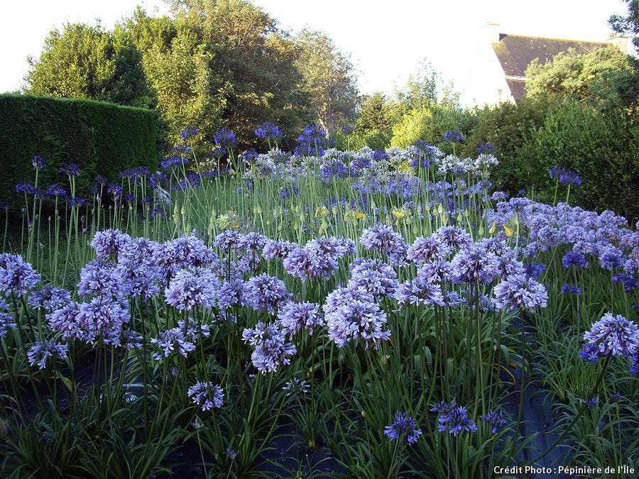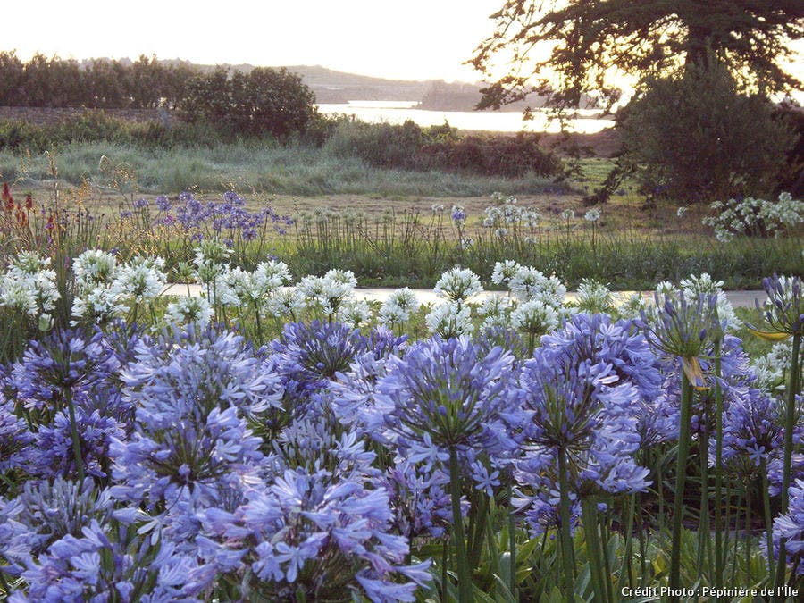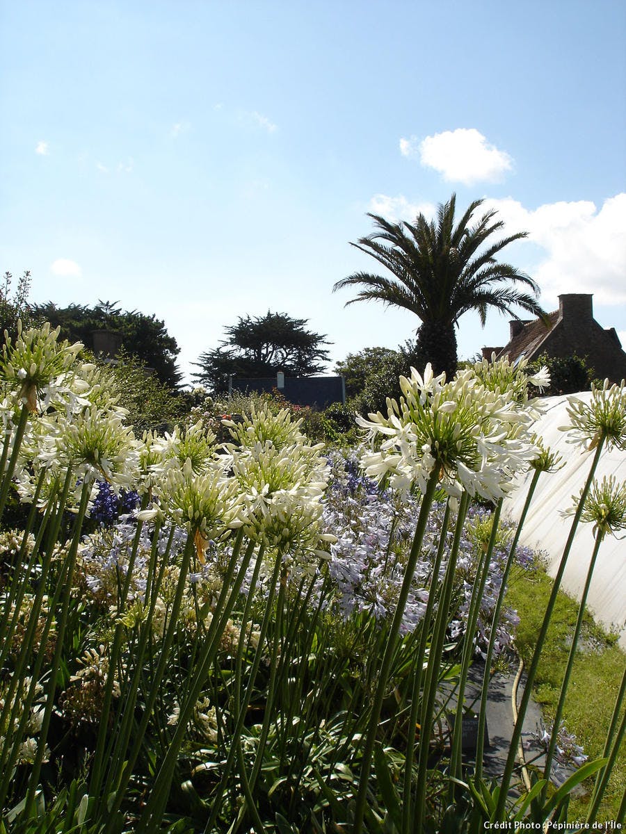Les agapanthes, blanches ou bleues, fleurissent de juin à septembre. Ici, des agapanthes dans les jardins de la pépinière de l'Île.