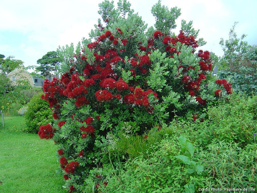 Metrosideros lucidus Mistral. Cet arbuste à feuillage persistant produit une belle floraison rouge à grandes étamines, en été. Il est rustique jusqu'à - 5°C.