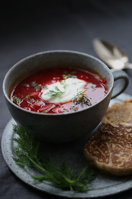 Elle est assez consistante et peut être servie en diner souvent avec une bonne tranche de pain de seigle . N'ayant pas de pain j'ai refait la recette des crêpes épaisses russes Oladimais à la farine de seigle . Dans le borscht il faut mettre une bonne cuillère de crème , en Russie nous avons de la crème bien épaisse un peu aigre qui va parfaitement avec cette soupe , je vous propose d'utiliser une crème épaisse , éventuellement que vous trouverez au marché ou un produit venant directement de la ferme pour gardeur cette touche légèrement aigre . pour 4 personnes : 3 betteraves crues (environ 600 gr)
