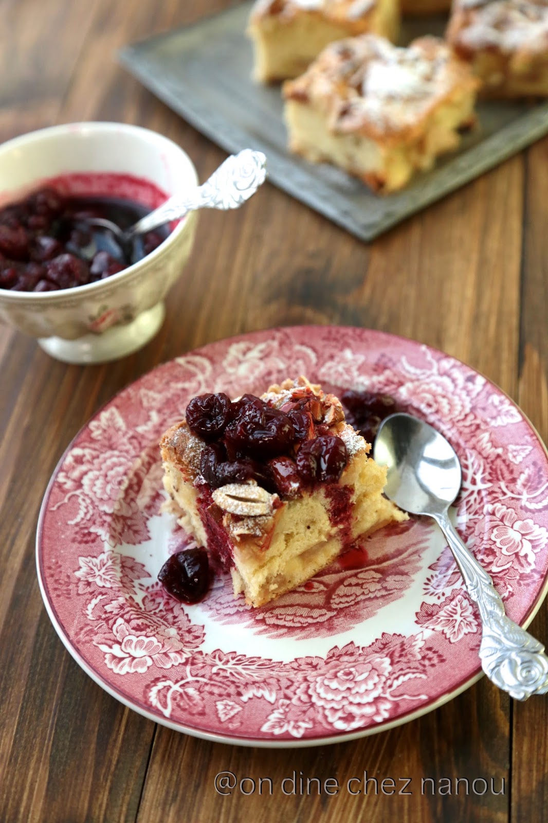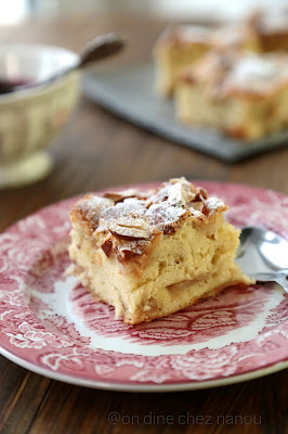 Le moule utilisé n'est pas très grand une prochaine fois j'utiliserai un moule à charnière de 22 cm et j'ajouterai la moitié en plus de pâte pour avoir un gâteau un peu plus haut . J'ai ajouté des amandes concassées à la surface avant la cuisson mais cela ne fait pas partie de la recette originale .