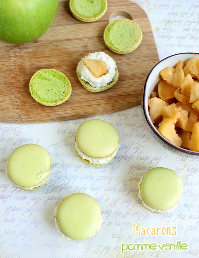Pour cette recette, j'ai préparé mes coques de macarons habituelles, à la meringue italienne. Je les ai garnies avec une crème bavaroise à la vanille (le nom fait peur mais c'est tout simple !) et j'ai disposé un morceau de pomme caramélisée dans chaque macaron. C'était très frais et délicieux !