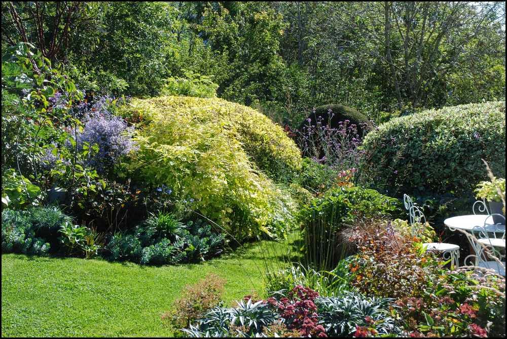 Balade Parmi Les Massifs. Des étendues engazonnées se frayent un chemin parmi les massifs de vivaces... Des sculptures et des treilles végétalisées côtoient les arbres fruitiers et conifères, à l'image de ce bel araucaria, l'arbre qui fait « le désespoir des singes » Mais c'est le bassin situé dans son axe central qui attire tous les regards ; il est gardé par deux majestueux hérons de métal qui veillent à ce qu'aucun intrus n'en perturbe la tranquillité... En vis-à-vis de la maison, un large chemin mène au bassin, en passant par le potager (à gauche) Heureux Mariage Des Vivaces & Des Graminées . Tout autour de ce bassin, Alain et Françoise Munier ont créé de généreux massifs mêlant vivaces et graminées avec, en fil conducteur, quelques pavots, leur fleur fétiche, et la couleur violette, déclinée avec élégance dans l'ensemble du jardin. Non loin du bassin, concerto bien maîtrisé de graminées, de digitales et de Thalichtrum (pigamon) aux pompons violets. Graminées, geraniums vivaces et topiaires ornent une petite rocaille 1-Les têtes rondes des alliums, atout graphique pour les jardins. 2-Les romantiques ancolies. 3-Charme pointilliste des Thalichtrum. 4-Un des nombreux pavots qui viennent chahuter les massifs du jardin. Autre fil conducteur du jardin... Les bouquets de nigelles de Damas, qui créent, au détour d'une allée, une ambiance de brume et de mystère. La nigelle de Damas se contente d'un sol pauvre et ne craint pas le soleil. Sa belle fleur étoilée enchante les jardins printaniers Un Jardin D'essai...Patiemment façonné depuis trente ans, le Jardin pour tous les Sens de Ceffonds est un véritable lieu d'expérimentation pour ses propriétaires...Qui souvent y restent tard le soir pour créer des massifs et s'essayer à des alliances étonnantes. Une mine d'idées à piocher pour les aventuriers du végétal ! Mariage des contraires entre les boules rondes et les couleurs tendres des alliums et les épines rouges des rosiers soyeux 1-Dans une zone ombragée du jardin, les feuilles claires de l'herbe aux goutteux (Aegopodium podagraria) apportent de la lumière. 2-Incitation à la rêverie sur cette chaise tutoyée par les ancolies