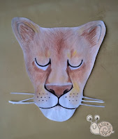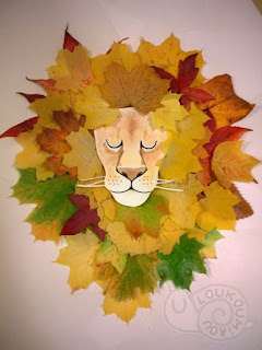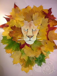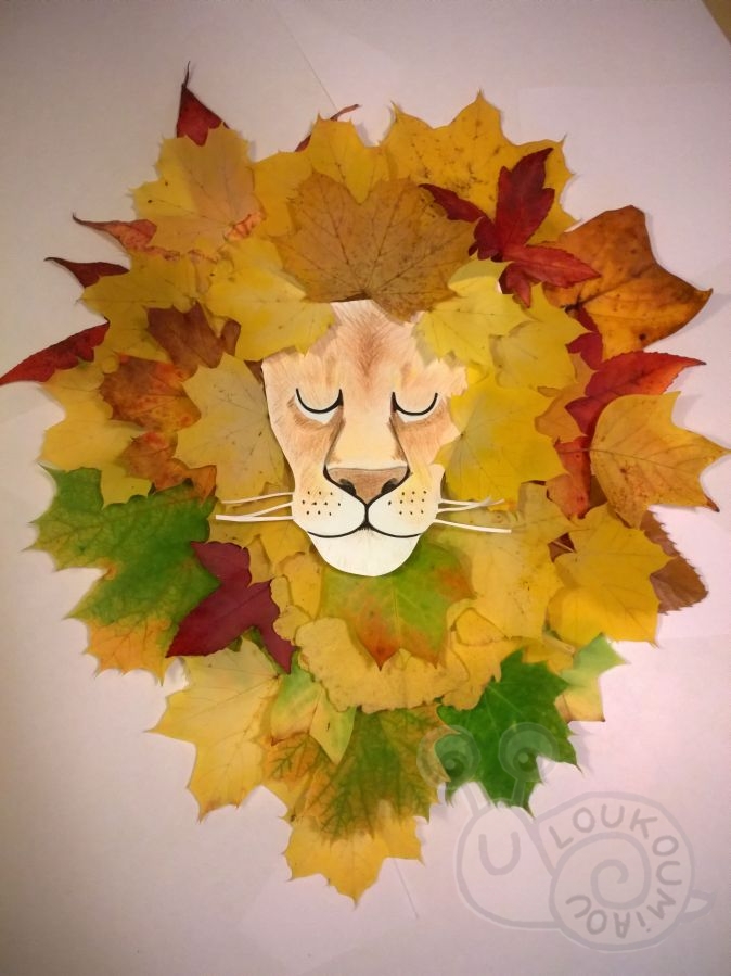 Dessinez une tête de lion (aux crayons de couleurs et feutre noir) et ensuite découpez. Positionnez des feuilles mortes autour du dessin