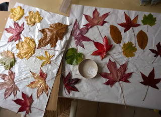 l’artiste allemande Susanna Bauer découpe et coud des feuilles mortes entre elles.